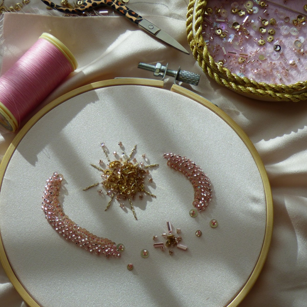 Un travail autour d’un motif simple d’inspiration cosmique, qui permettra d’aborder plusieurs techniques créatives autour de fournitures utilisées en broderie d’art, dont :